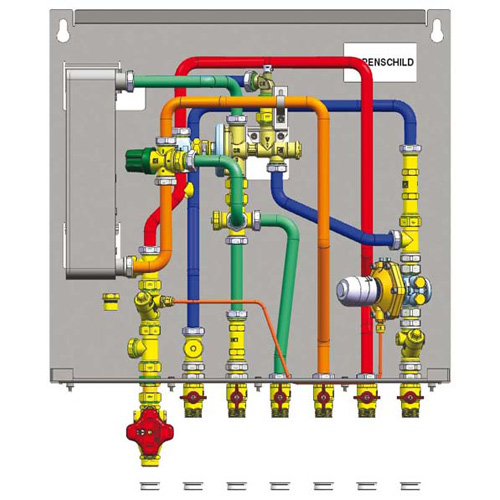 Compact substation for drinking water systems and radiator heating utilising a countercurrent heat exchanger made of Cu/Ni brazed stainless steel. Central controller for hot water only operates as a pressure drop is detected when a hot tap is opened. Assembly is available in surface-mounting or flush-mounted versions. Pipe connection to an HIU is realised by means of a patented mounting system with pre-mounting unit. This unique installation system saves the installer the often complicated and time-consuming calibration and adjustment measures required on existing (pre-) installations. Ball valves can be connected optionally to the wall or to the floor. Pipe connection is realised by means of ball valve with T-handle. Balancing valve for regulating the water flow rate is installed before station’s enter.