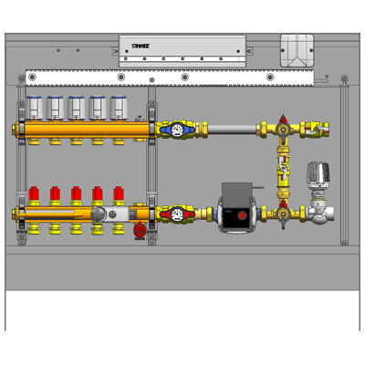Rod distributor made of brass, flow distributor with control inserts with fl ow rate display and return distributor with thermostatic valves, bleed and drain valve with hose connection. Distributor mounting brackets