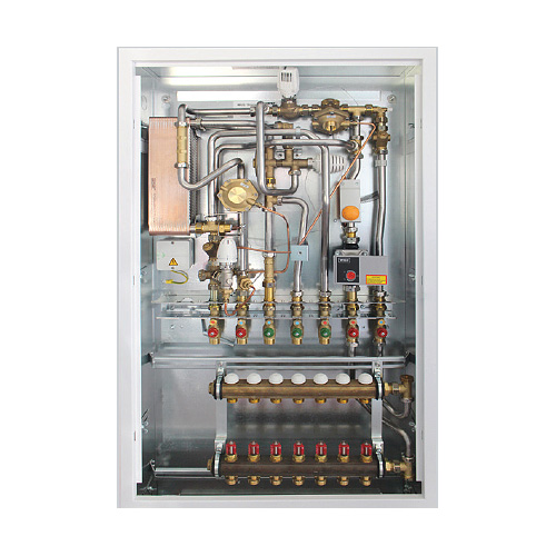 Compact substation for drinking water systems and radiator heating utilising a counter current heat exchanger made of Copper brazed stainless steel. Central controller for hot water only operates as a pressure drop is detected when a hot tap is opened. Assembly is available in surface mounting or flush-mounted versions. Pipe connection to an HIU is realised by means of a patented mounting system with pre-mounting unit. This unique installation system saves the installer the often complicated and time-consuming calibration and adjustment measures required on existing (pre-) installations. Ball valves can be connected to the fl oor.