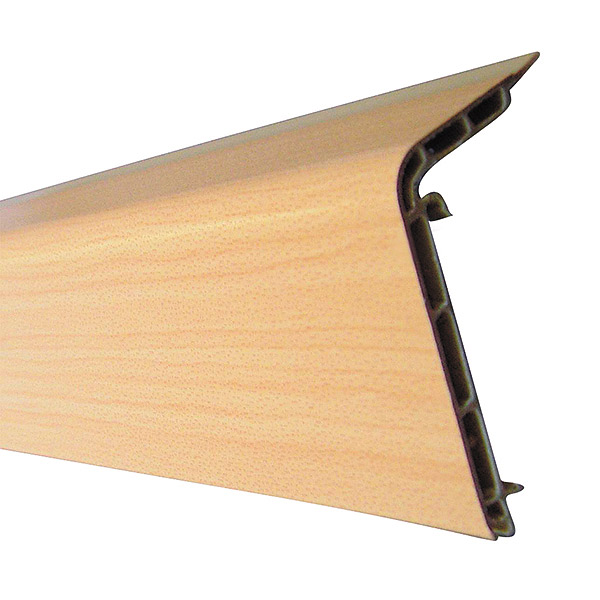 plastic skirting board, re-cycled PVC hollow profi le laminated with light-fast foil. Sealing lip extruded in colour of skirting board, snap-on fi xing on ledge handles.