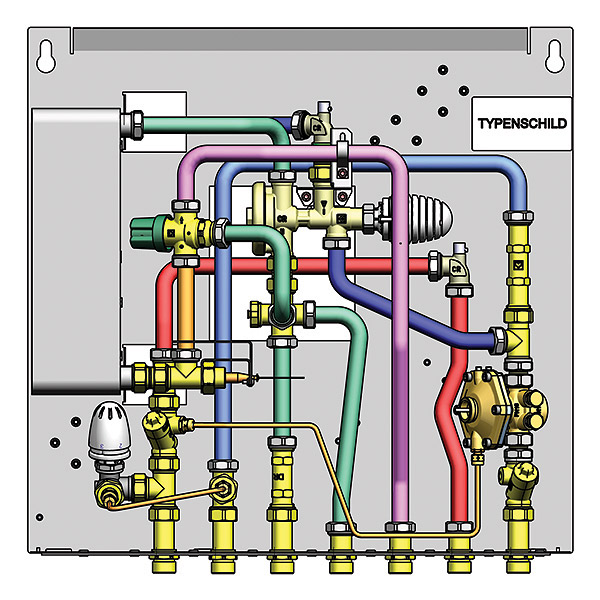 Compact substation for drinking water systems and radiator heating utilising a counter current heat exchanger made of Copper brazed stainless steel. Central controller for hot water only operates as a pressure drop is detected when a hot tap is opened. Assembly is available in surfacemounting or flush-mounted versions. Pipe connection to an HIU is realised by means of a patented mounting system with pre-mounting unit. This unique installation system saves the installer the often complicated and time-consuming calibration and adjustment measures required on existing (pre-) installations. Ball valves can be connected to the floor.