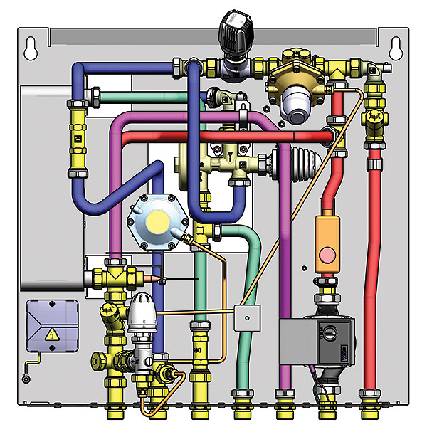 Compact substation for drinking water systems and radiator heating utilising a counter current heat exchanger made of Copper brazed stainless steel. Central controller for hot water only operates as a pressure drop is detected when a hot tap is opened. Assembly is available in surface mounting or flush-mounted versions. Pipe connection to an HIU is realised by means of a patented mounting system with pre-mounting unit. This unique installation system saves the installer the often complicated and time-consuming calibration and adjustment measures required on existing (pre-) installations. Ball valves can be connected to the floor.