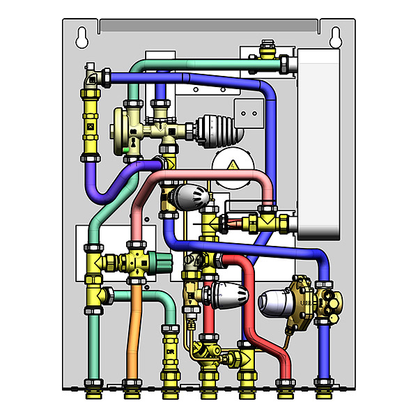 Compact substation for drinking water systems and radiator heating utilising a counter current heat exchanger made of Cu brazed stainless steel. Central controller for hot water only operates as a pressure drop is detected when a hot tap is opened. Assembly is available in surface-mounting or flush-mounted versions. Pipe connection to an HIU is realised by means of a patented mounting system with pre-mounting unit. This unique installation system saves the installer the often complicated and time-consuming calibration and adjustment measures required on existing (pre-) installations. Ball valves can be connected optionally to the floor. Control valves with return flow temperature limiter for lower heating return temperature.
