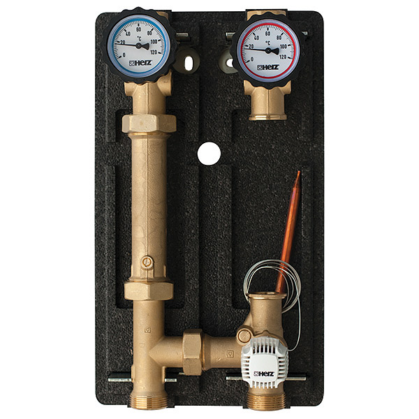 Cost, time-and space-saving mounting of the boiler to the pipe line systems - Pre-assembled connection set for pumps with length 180 mm - Insulation as standard Consisting of: - Integrated ball valve with thermometer with handle (red - Supply, blue - Return) - Distance piece with check valve - CALIS mixing valve with thermostatic valve with remote sensor - Distance between supply and return pipe: 125 mm - Max. temperature: 110°C - Max. operating pressure: 10 bar - Temperature range: from 0°C to 120°C.