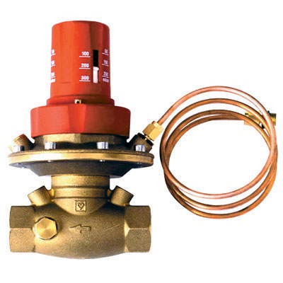 Proportional controller, for two-pipe systems with thermostatic radiator valves. Differential pressure 50–300 mbar, continuously adjustable. Dezincification resistant brass body, pipe connection with threaded pipe connection on both sides, including capillary 1000 mm. 2 bores 1/4, with screw plug 1 0273 00. Drain valve 276 has to be ordered separately.