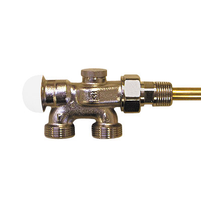 Radiator connection from below, with flat seal, submerged pipe l = 290 mm, Ø =11 mm. Pipe centre distance 40 mm. The radiator can be removed while the system is under pressure. The valve upper part can be changed by means of HERZ Changefix Tool. Pipe connections G 3/4 with cone. Pipe connections have to be ordered separately. Circulation brake 1 6222 01 has to be ordered separately.