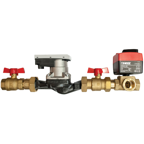 For solid fuel boilers and biomass systems, in order to maintain a minimum boiler return temperature. Consisting of EUROMIX mixing valve, isolation valve, circulating pump and isolation valve with backflow preventer, factory assembled and leakage tested, 1/4 turn mixing valve with electric actuator. Design: 1/4 turn mixing valve with electric actuator.