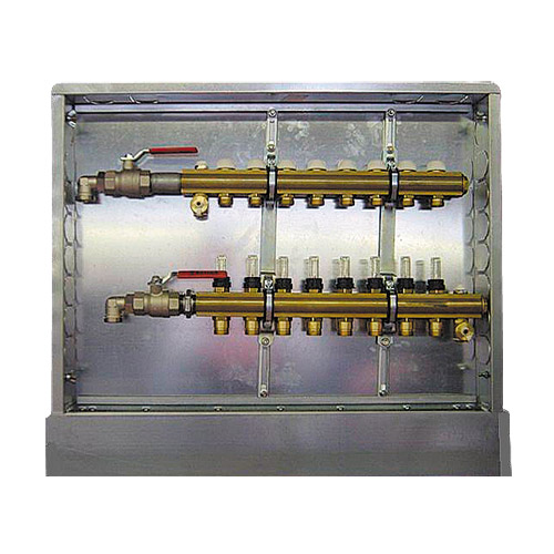 - Rod distributor made of brass, flow distributor with control inserts with flow rate display and return distributor with thermostatic valves, bleed, drain valve with hose connection and 2 end caps. - Distributor holding device - Ball Valves brass version with full bore - Adapter and connecting places pre-assembled in distributor cabinet made of galvanized steel sheet, front frame and door powder coated, white (RAL 9010). Adjustable installation depth (80–110 mm), cabinet height 705–775 mm, with removable pipe rail tracks. Radiator connection is not temperature controlled.
