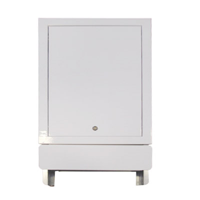 HERZ-Distributor Cabinet, made of steel plate for HERZ-Floor Rod-type Distributor Galvanised, front door and front frame powder coated, white (RAL 9003). Adjustable installation depth (80–110 mm), cabinet height (705–775 mm), fastening rail for distributor holding devices as well as front screen. With removable pipe rail tracks. Cabinet door with bolt.